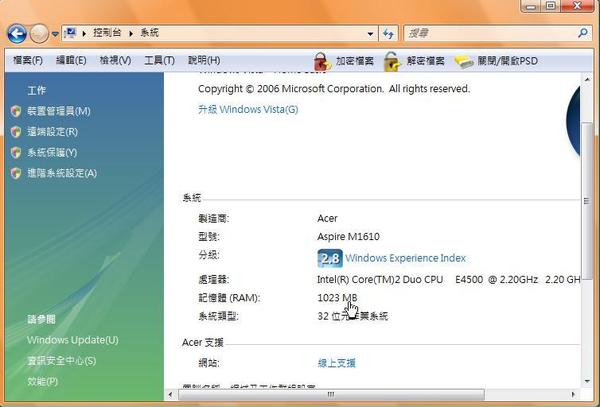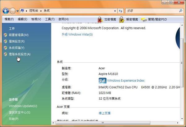 3.開啟"系統內容",得知原有的記憶體大小。(如圖,此電腦的記憶體大小為1023mb)