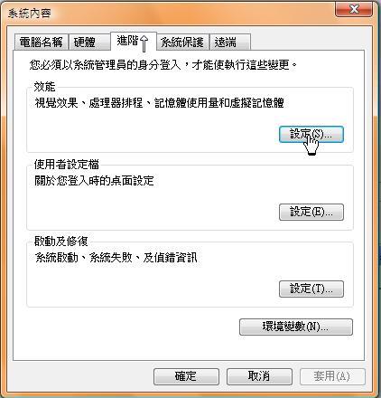 4.選擇"進階"系統設定,在"效能"區點選設定鈕。