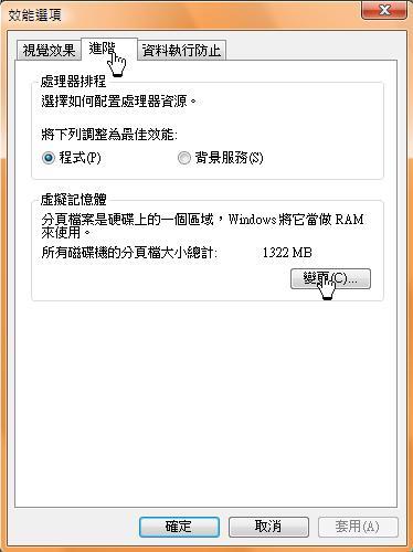 5.出現"效能選項"視窗,選擇"進階"標籤,在"虛擬記憶體"區點選"變更"按鈕。